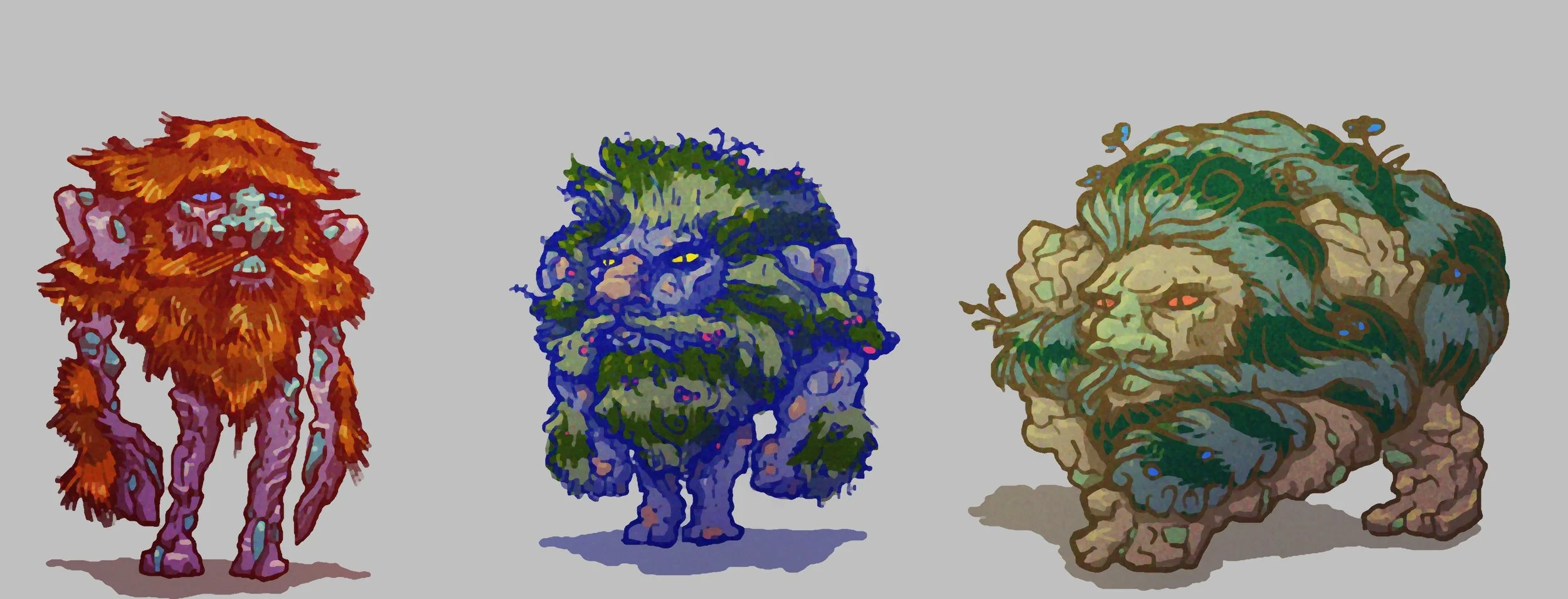 A group of earth elementals with a squat body and thick limbs. They typically looks like a large stone face with stocky arms and legs made of earth and stone. They have mosses and plants growing out of their head and face that is similar to hair